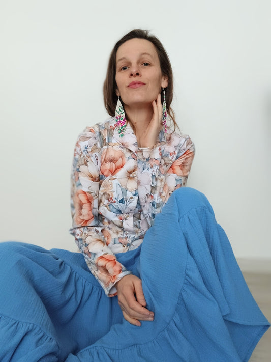 MAXI SUKNĚ KASKÁDOVITÁ MUŠELÍNOVÁ MODRÁ