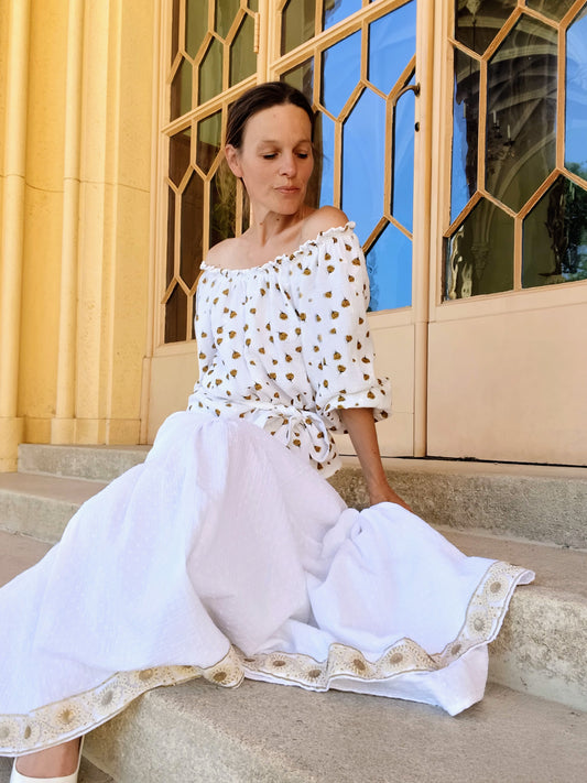 MAXI SUKNĚ SNĚHOBÍLÁ S BORDUROU (NÁDHERNÁ APLIKACE STUHY V BOHO STYLU)