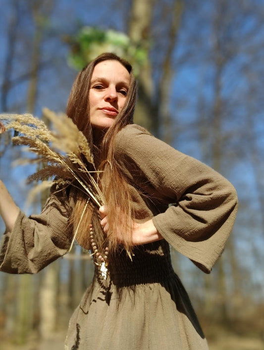 LESNÍ VÍLA V KHAKI ZELENÝCH MAXI ŠATECH
