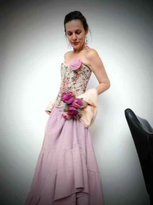PŘEKRÁSNÁ STARORŮŽOVÁ MADEIRA MUŠELÍN MAXI SUKNĚ