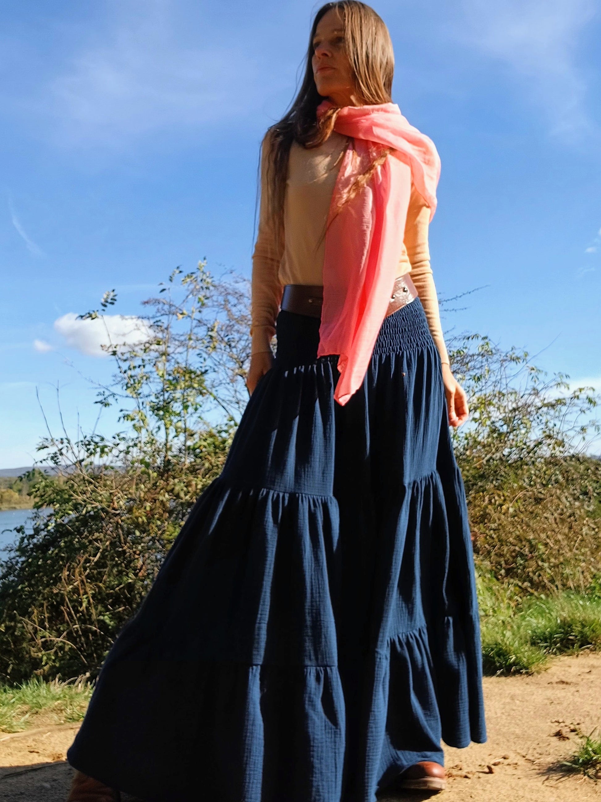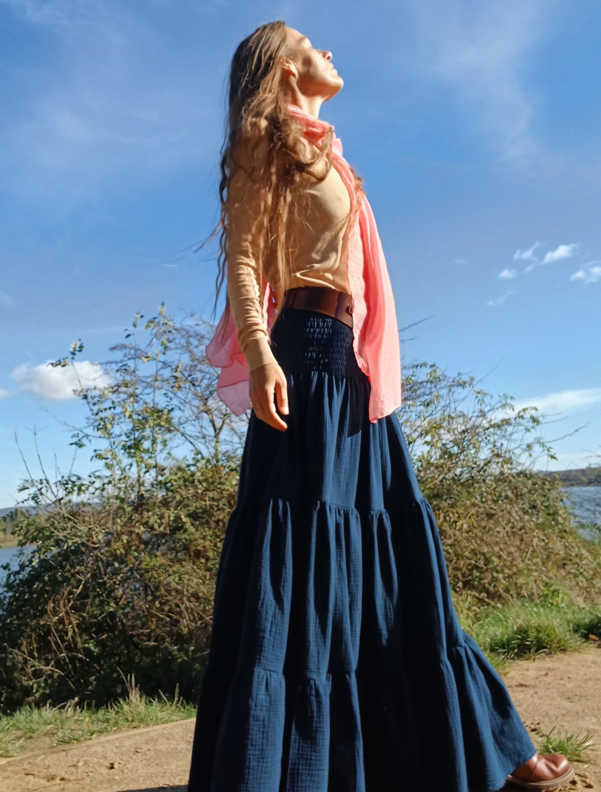 MAXI SUKNÉ TMAVÁ PŮLNOČNÍ MODRÁ MUŠELÍN ORGANIC