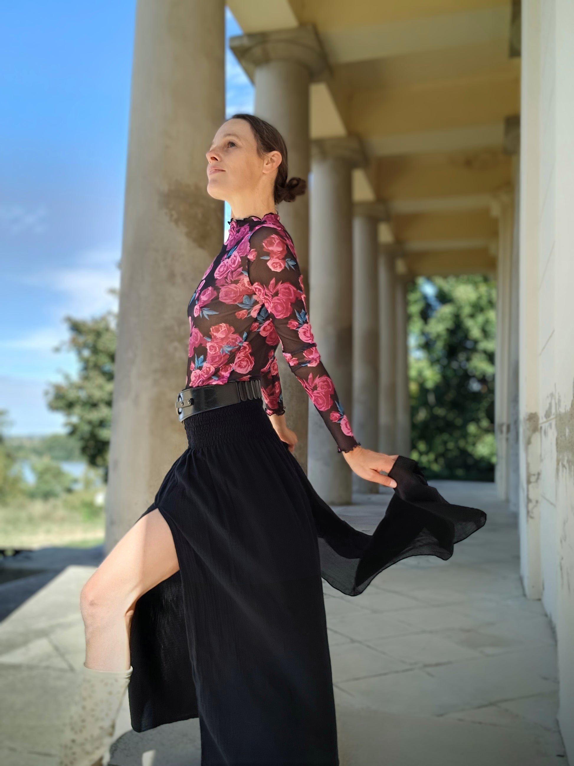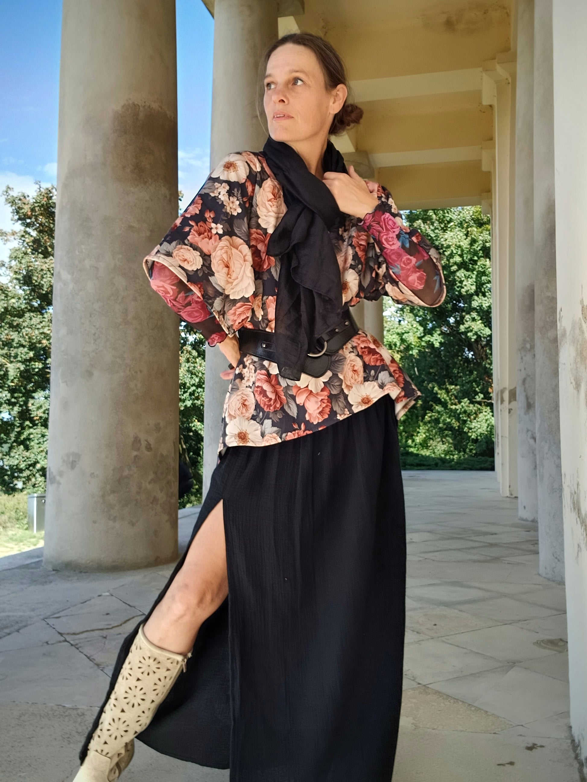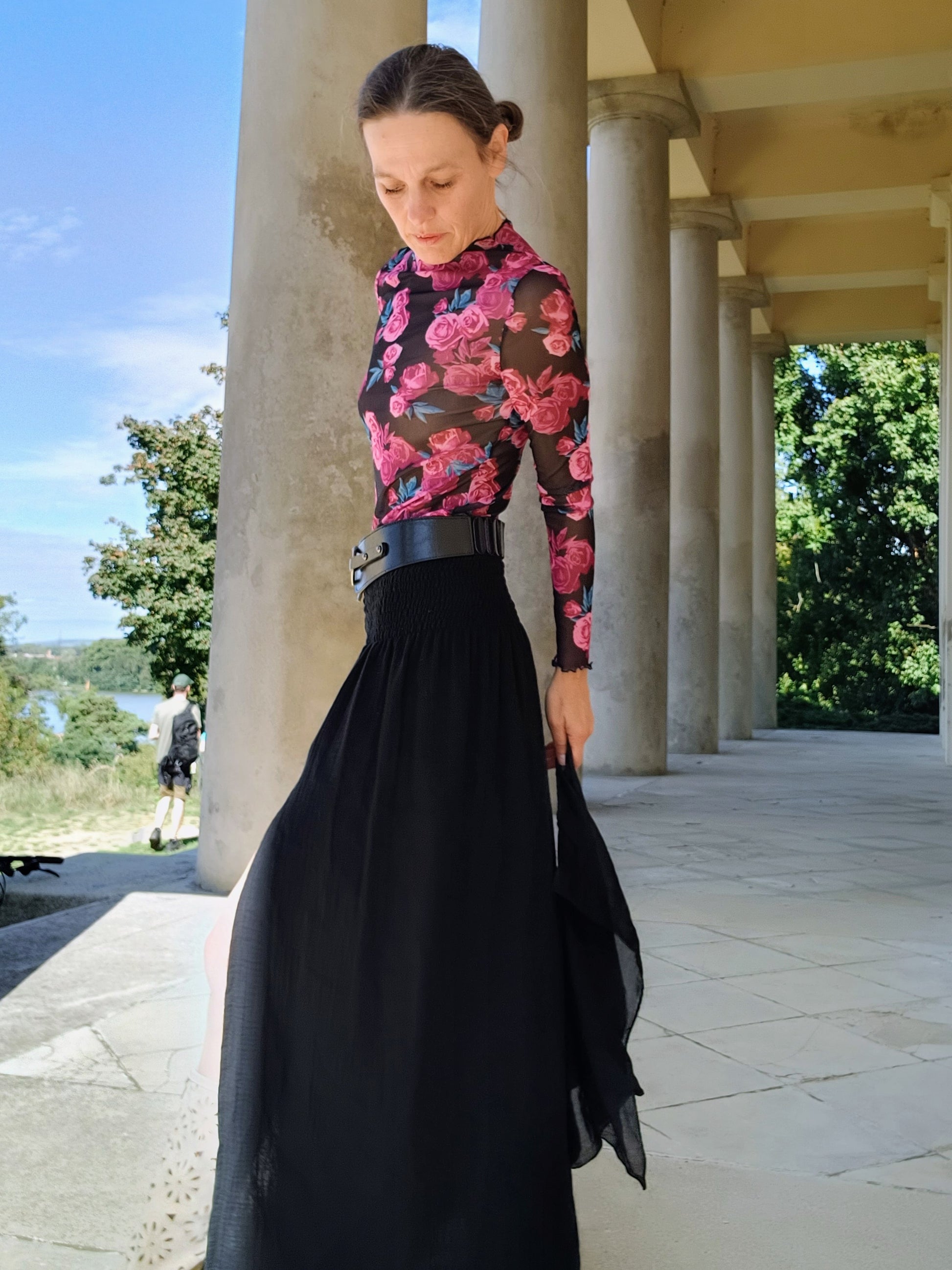 ČERNÁ DLOUHÁ SUKNĚ MUŠELÍNOVÁ S ROZPARKEM