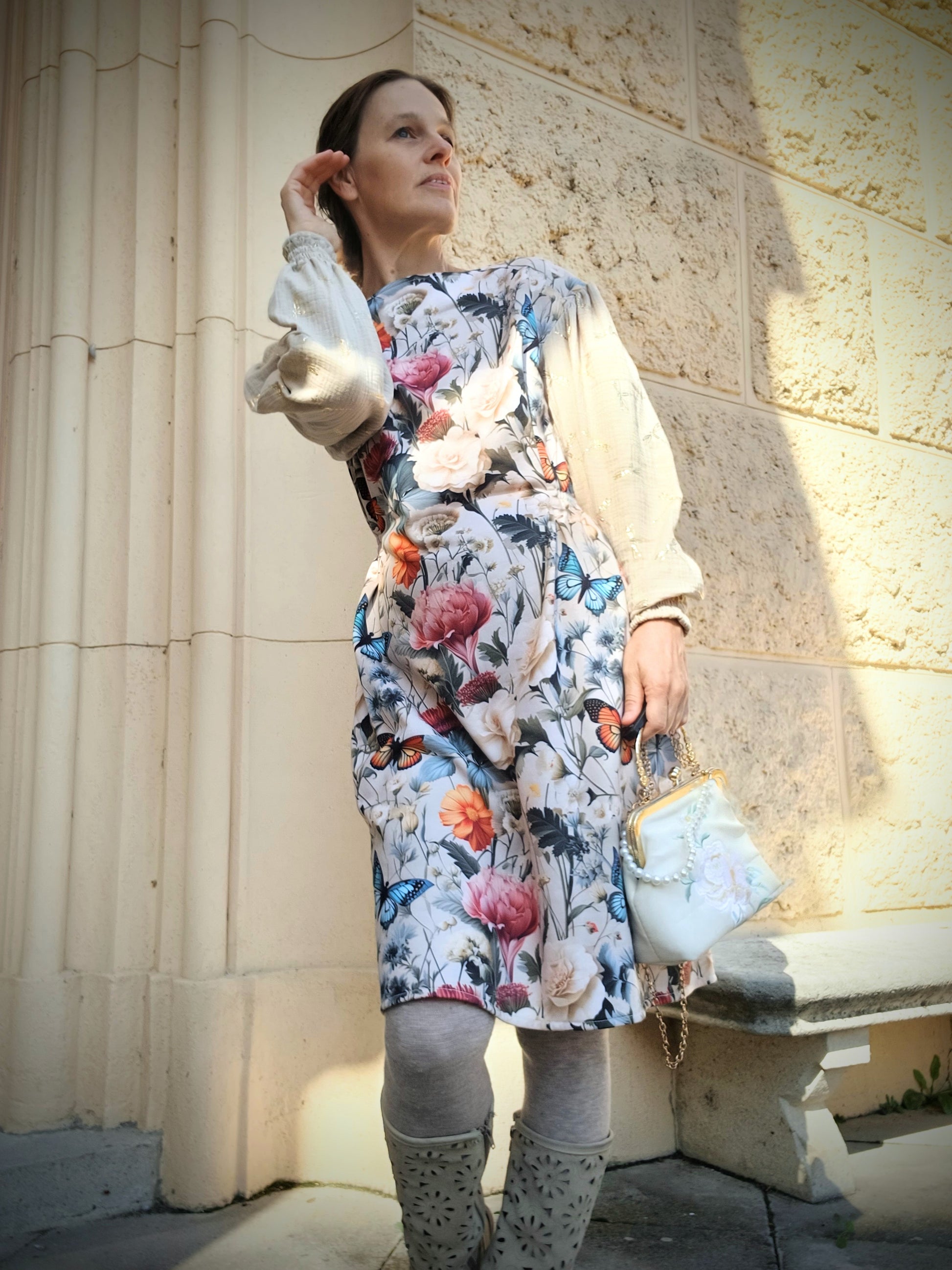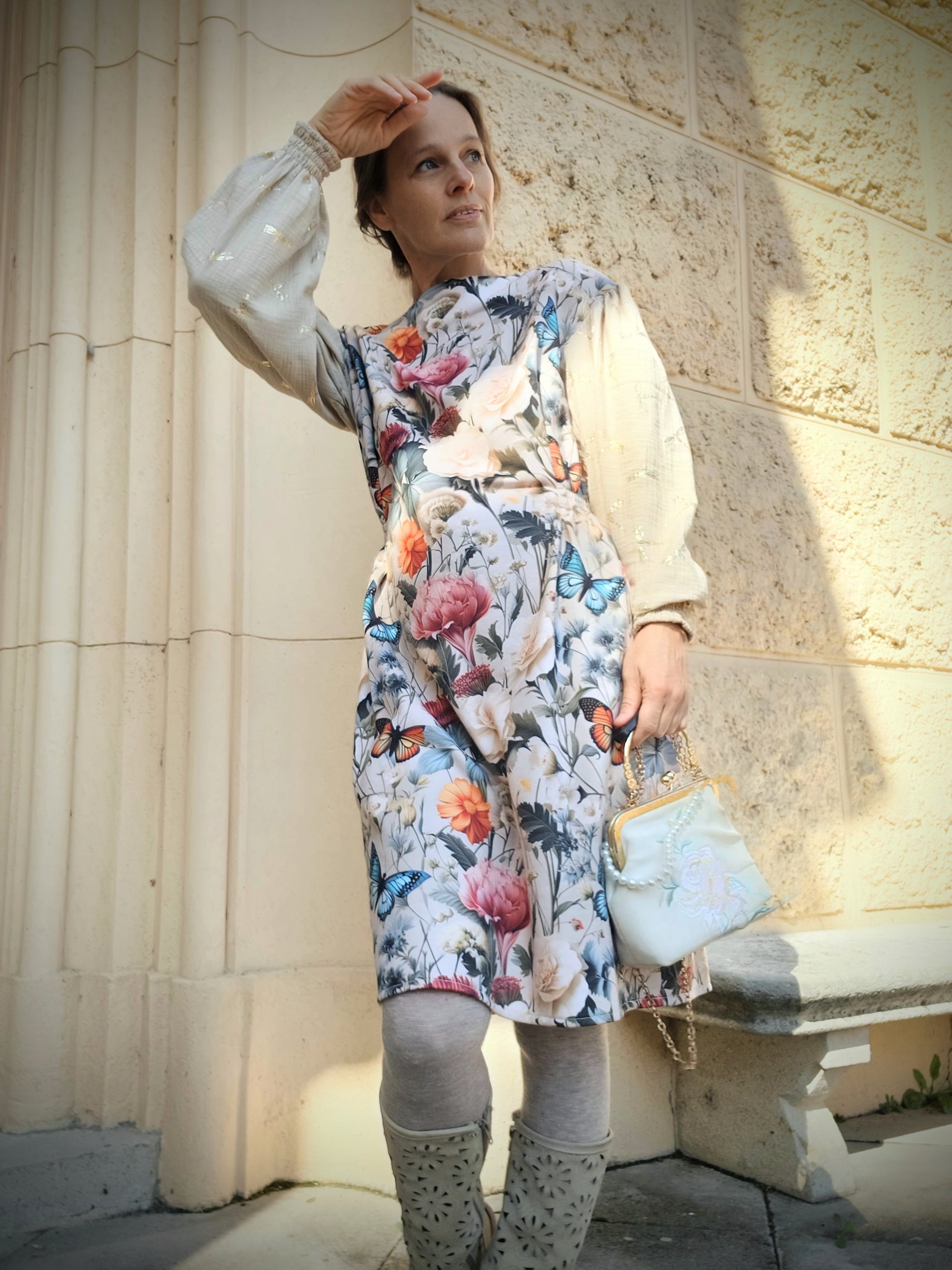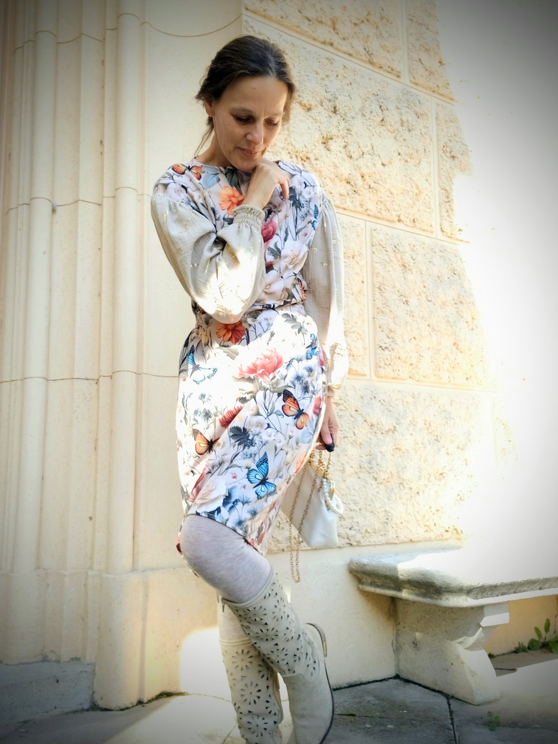 EXLUSÍVNÍ ŠATY Z DESIGNOVÉ TEPLÁKOVINY S RUKÁVY Z MUŠELÍNU