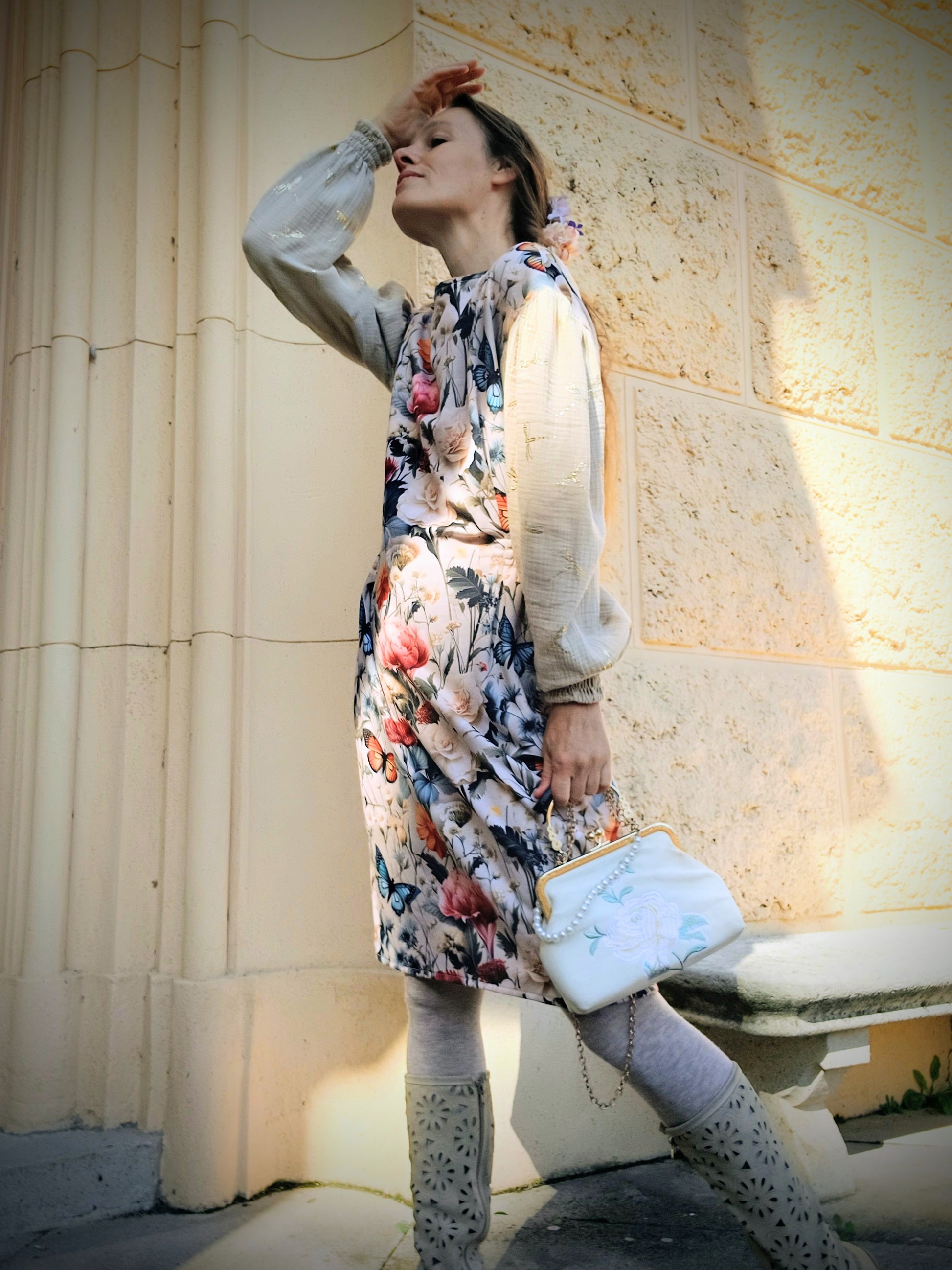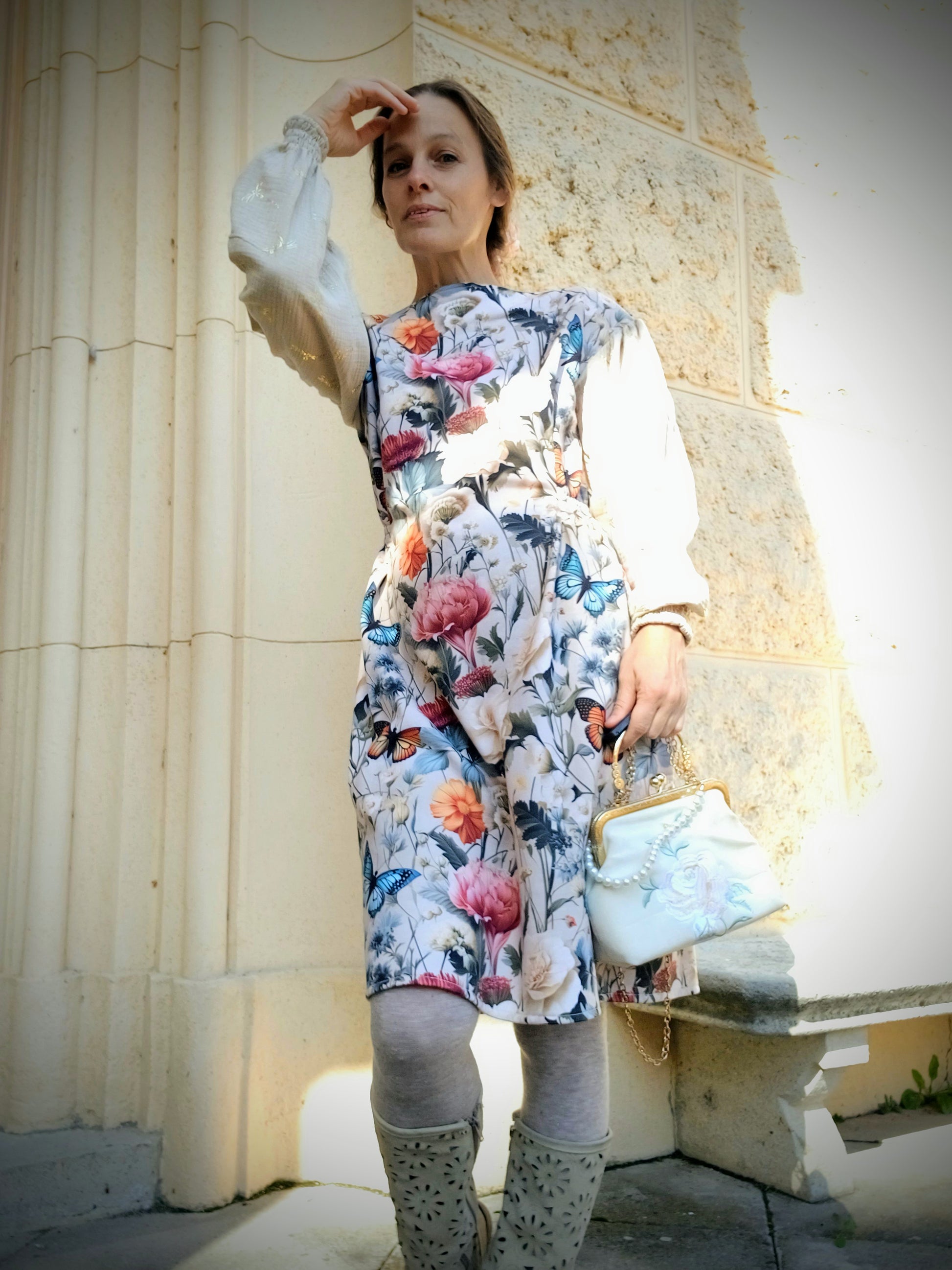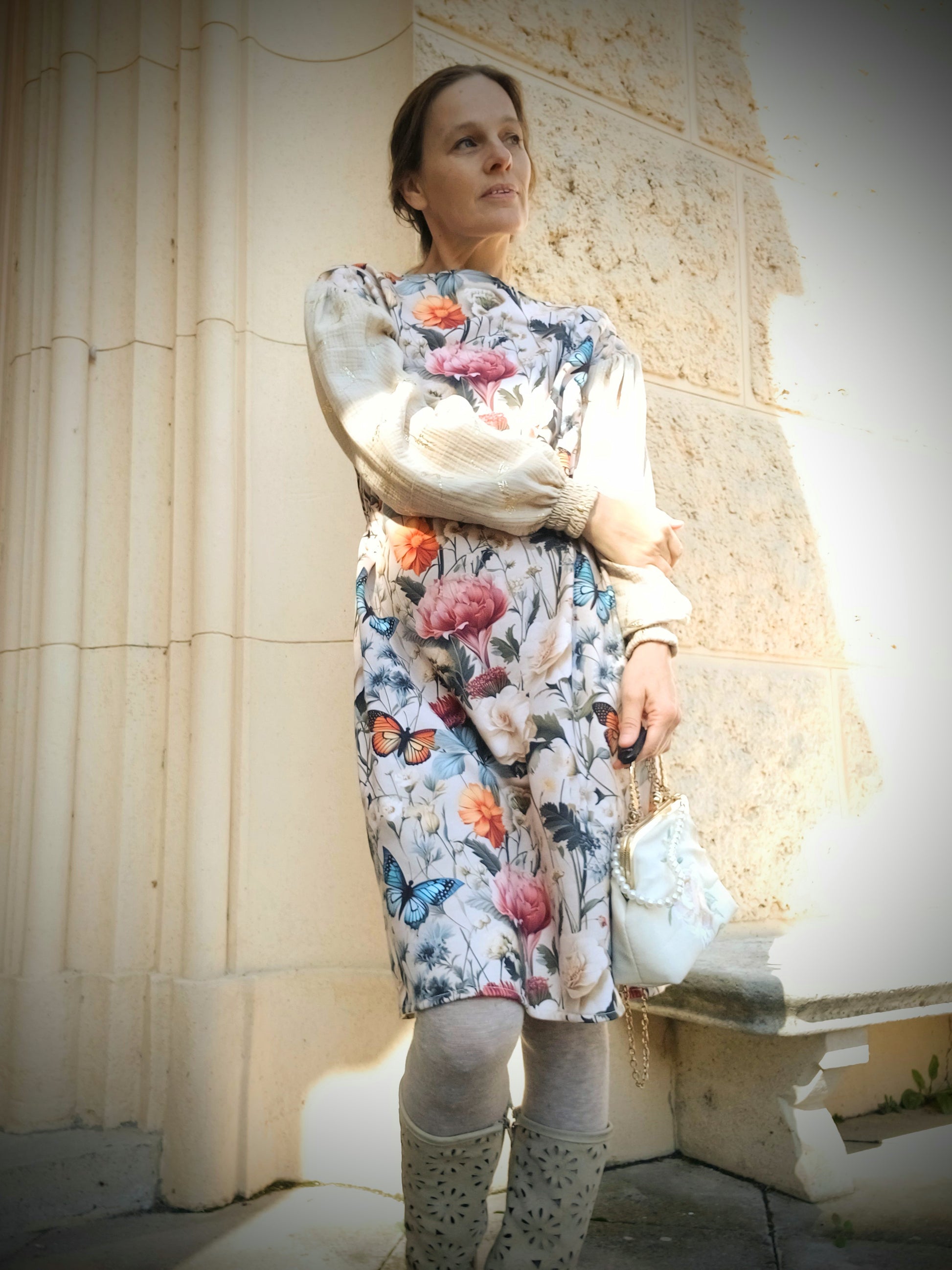 EXLUSÍVNÍ ŠATY Z DESIGNOVÉ TEPLÁKOVINY S RUKÁVY Z MUŠELÍNU