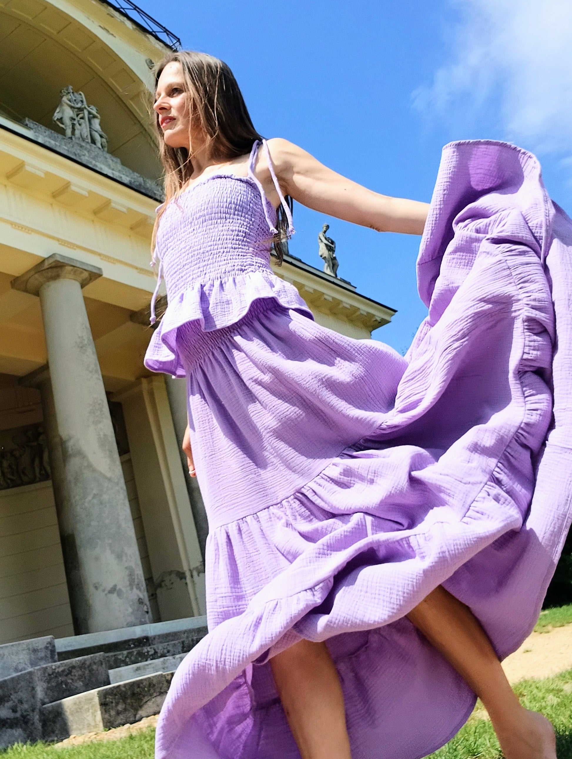 Materiál velmi kvalitní měkký mušelín vytvářející překrásné vlnění sukně při chůzi, právě díky velkému objemu spodního volánu
